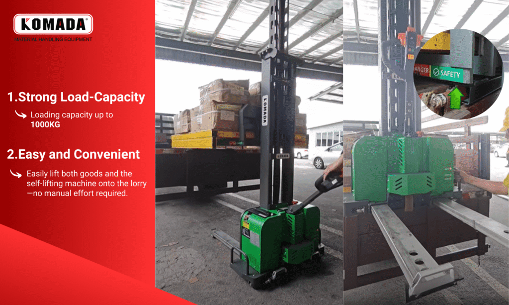 Komada™ Fully Powered Self Lifting Stacker is designed for warehouses, factories, and logistics centers, offering a fully electric drive system for effortless material handling. With its 1000kg (1-ton) load capacity and 1500mm lifting height, this stacker improves efficiency while reducing manual labor.