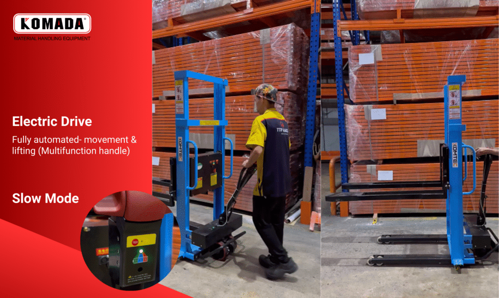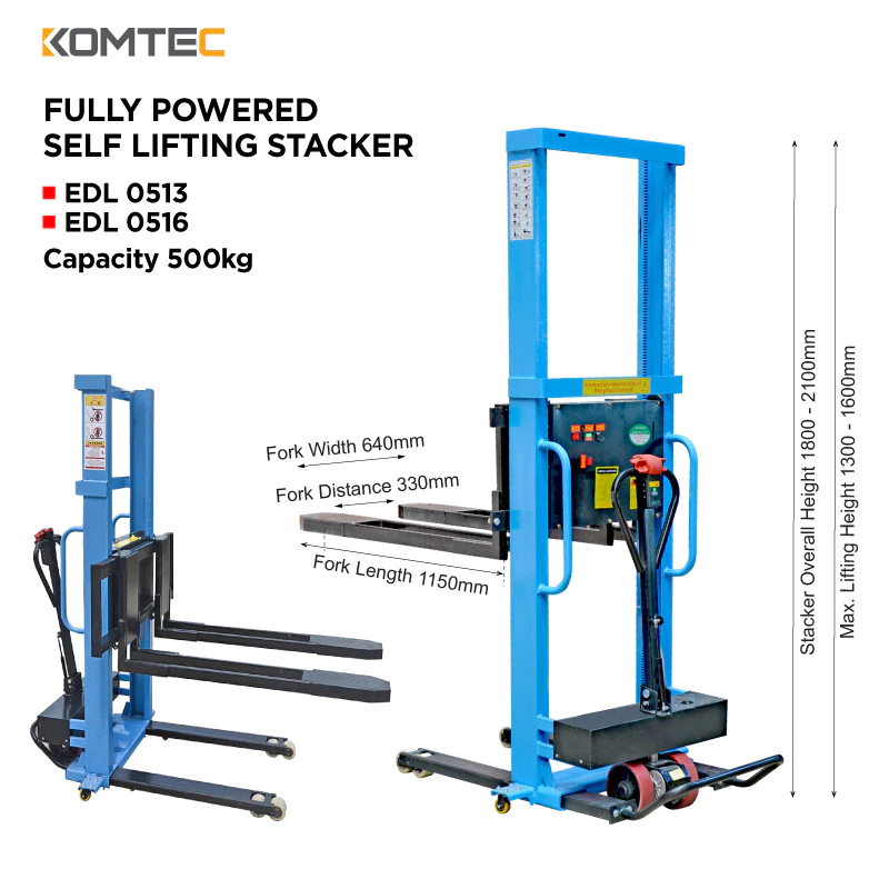 Komada Fully Powered Self-lifting Stacker provide 500kg load capacity. The upgraded version of semi automated, will a electric movement handle, save energy and time.
